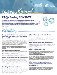 To protect the health of our staff, volunteers, and guests, we’ve implemented safety protocols for adoptions, veterinary appointments, and animal intakes. Please read our FAQs During COVID-19 to help you plan your visit.