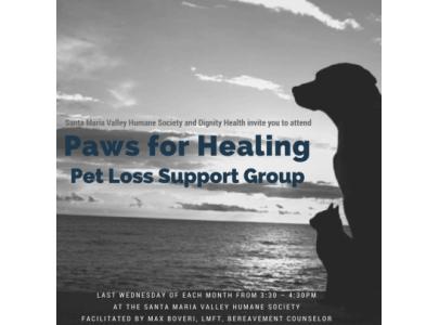 The Santa Maria Valley Humane Society and Dignity Health invite you to attend Paws for Healing, a pet loss support group. Grieving our pet is a natural and necessary process that allows us to honor these special companions, heal from our loss, and gain a renewed sense of hope over time. Share stories, pictures, and take the time to pause, grieve, and heal from your loss.
